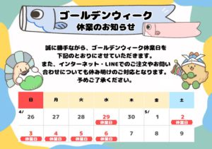 ゴールデンウィーク休業 : 4月29日(水)、5月2日(土) ~5月6日(水)